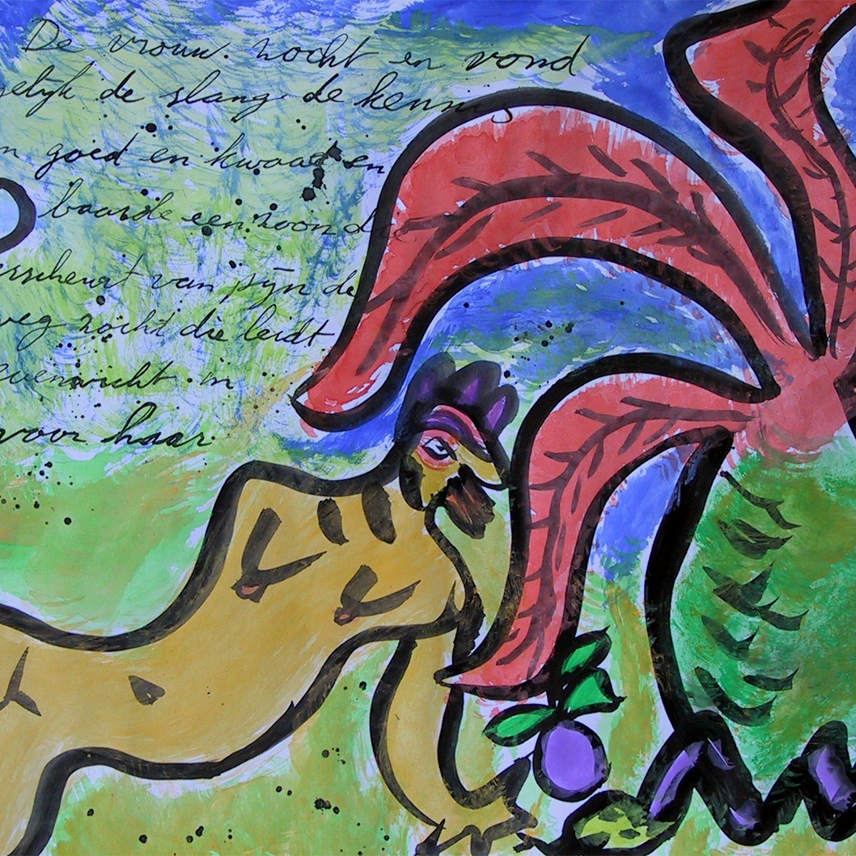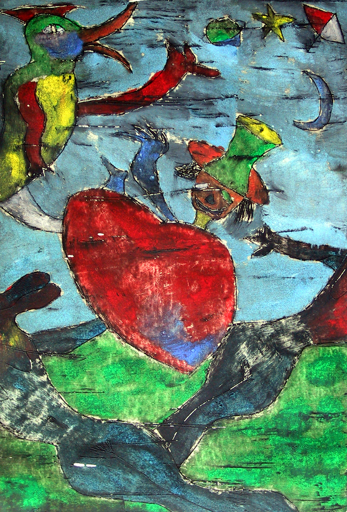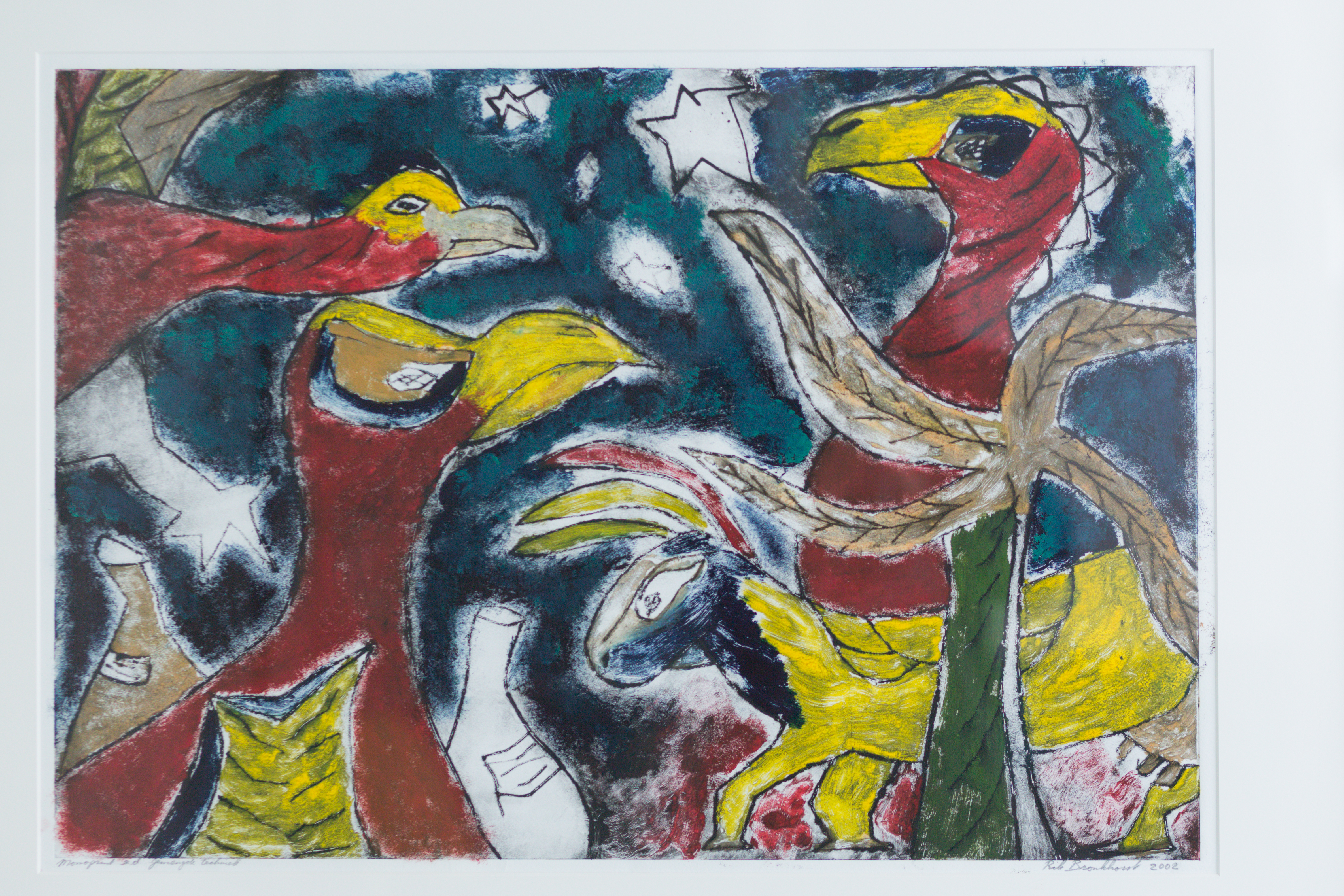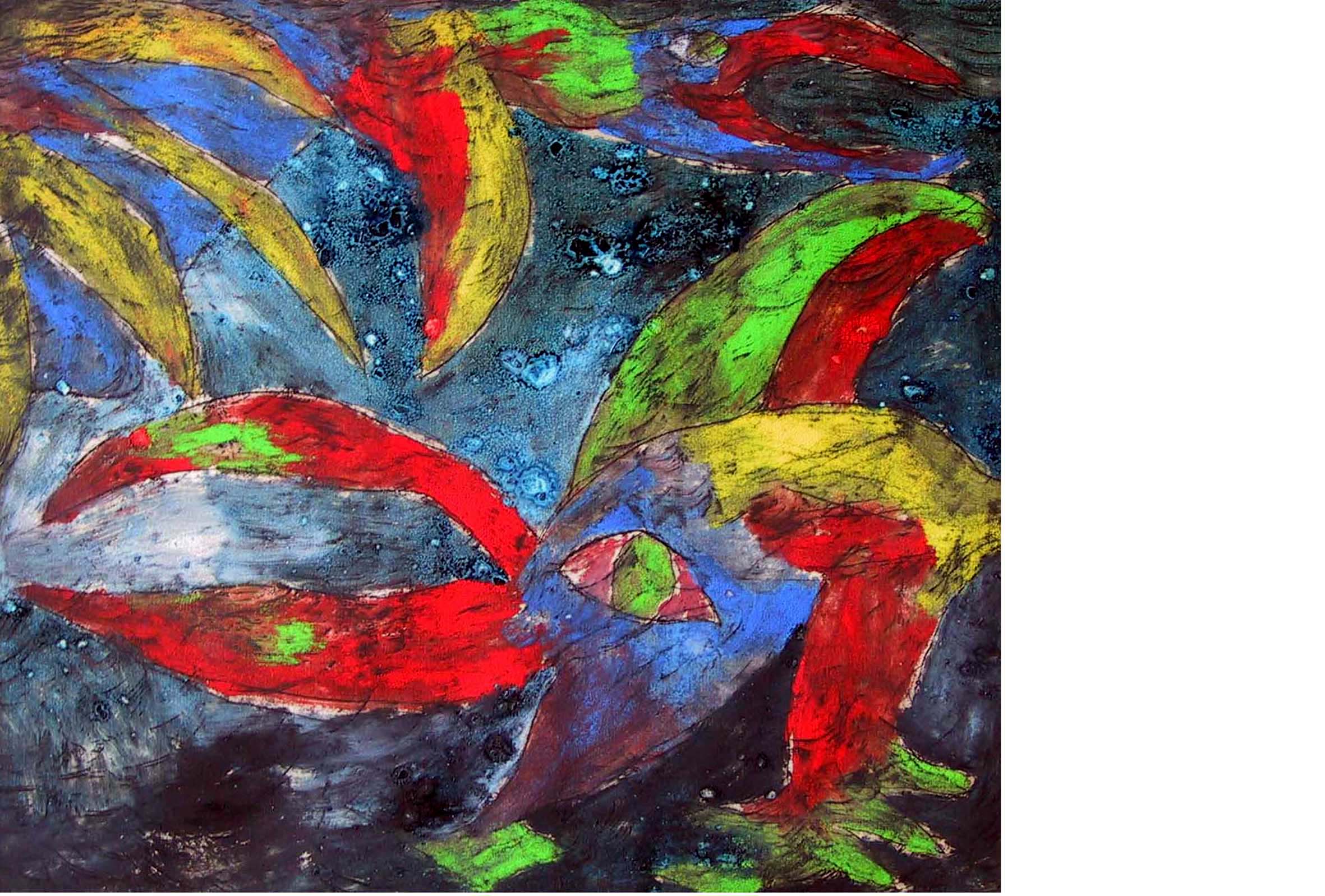Bij de ballotage bij Pulchri Studio Den Haag is de examencommissie meerdere malen teruggekeerd om zich af te vragen ‘hoe doet ie dat toch’. Tja, dat nu is het geheim van de smid. Het grafisch vak en met name de grote etsen in kleur bereiken een fase vol magie als het werk onder de pers vandaan komt. Op het moment dat het etspapier van de plaat gescheiden wordt is dat magische moment daar. De inkt is nog nat en glimt, de kleuren spatten je tegemoet, de reuk van inkt en olieverf streelt je neusgaten. “Is het gelukt?” Ja! De schare kunstenaars in het etsatelier slaken verrukt kreetjes van bewondering. Het nieuwe kunstwerk dat de wereld aanschouwt is daar. Magie! Ik ben volslagen uitgeput en drink twee flesjes water achterelkaar leeg.