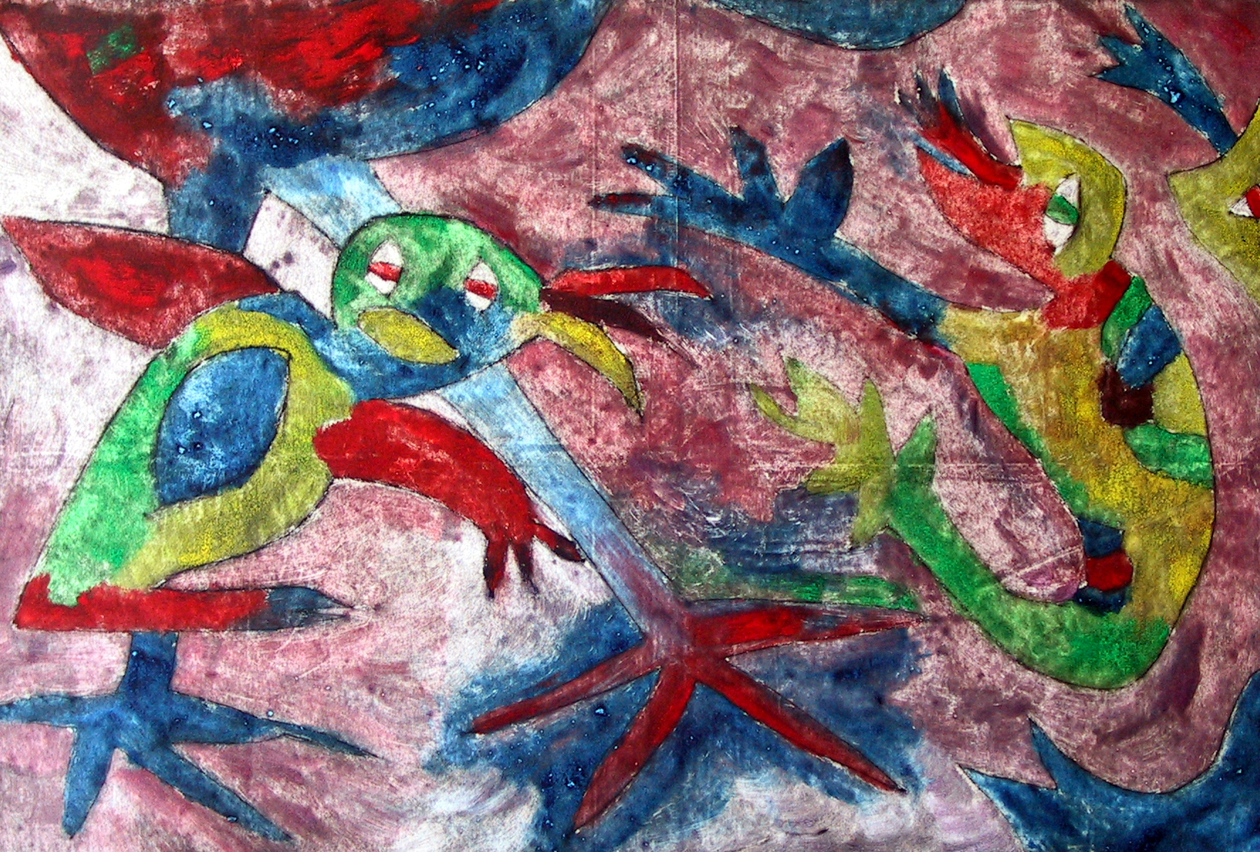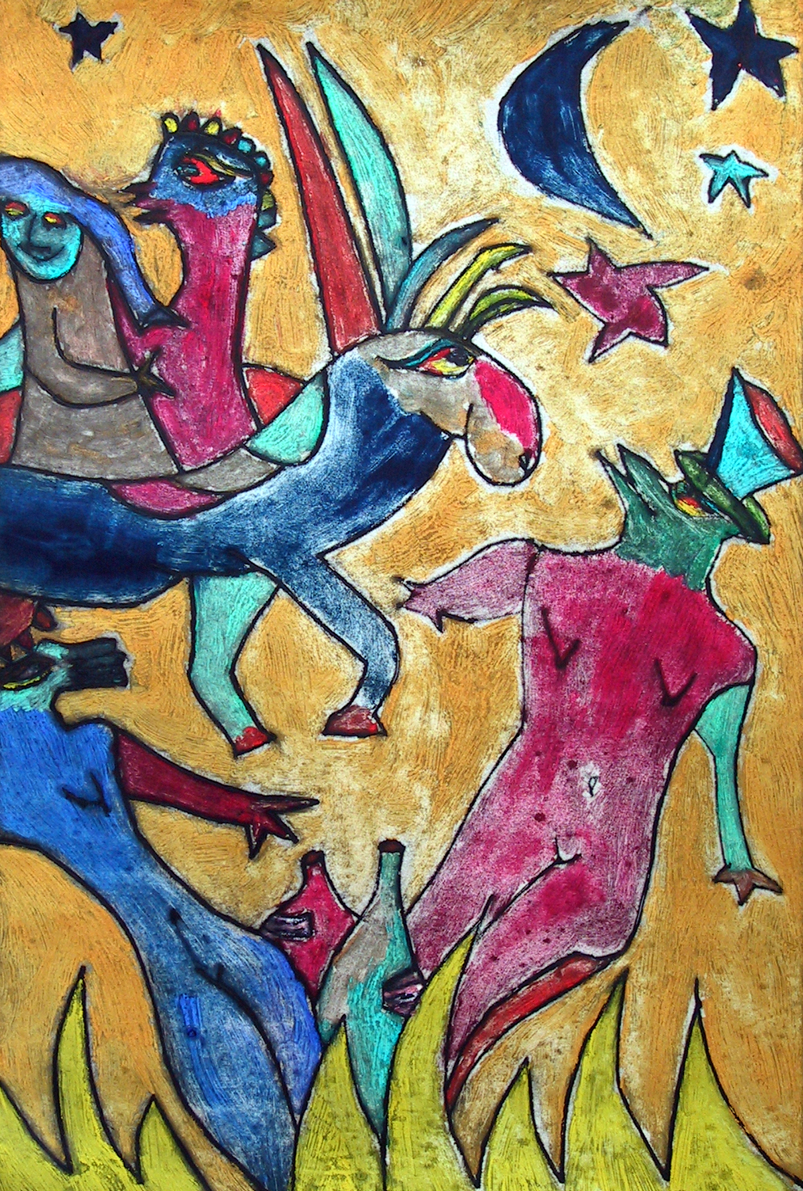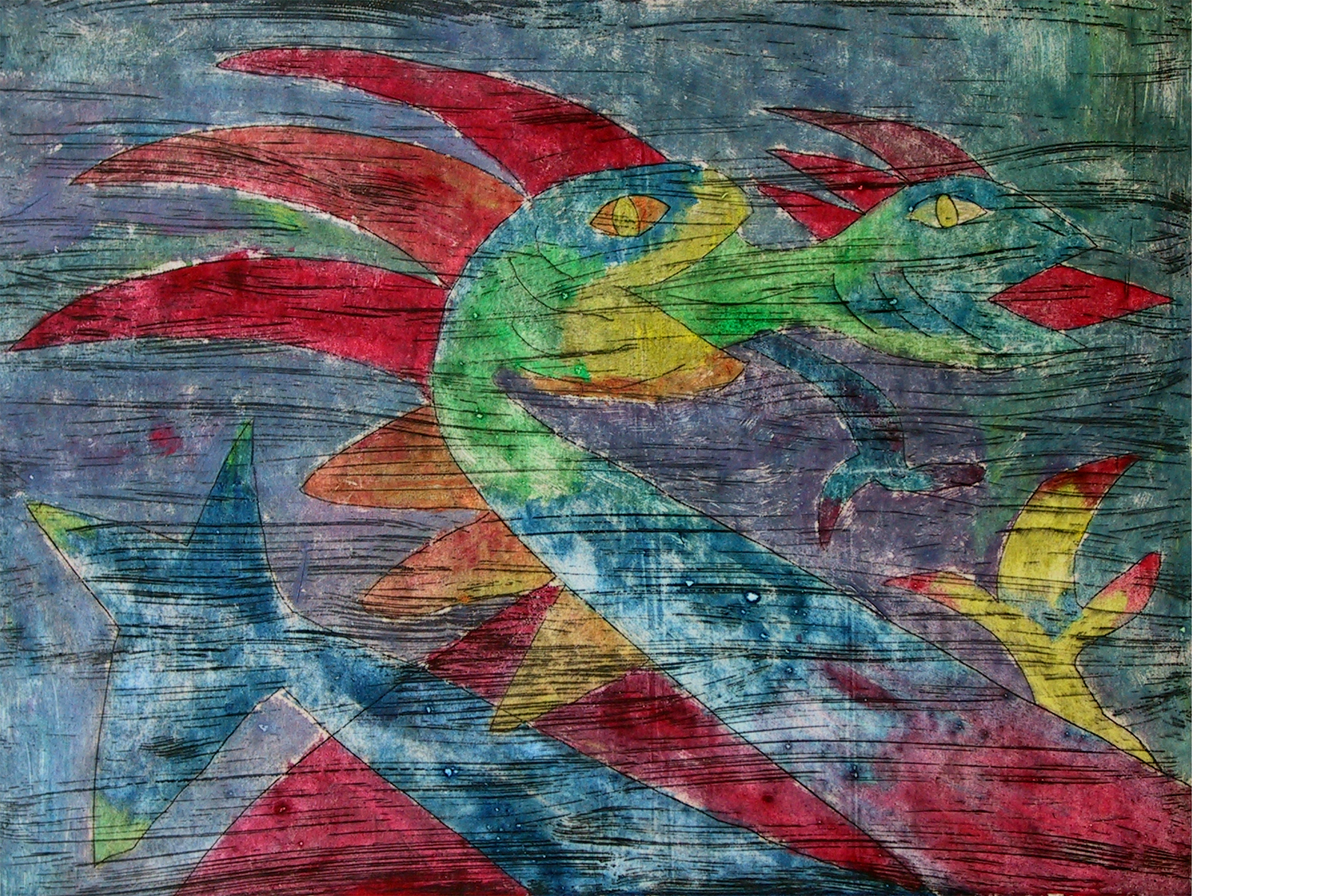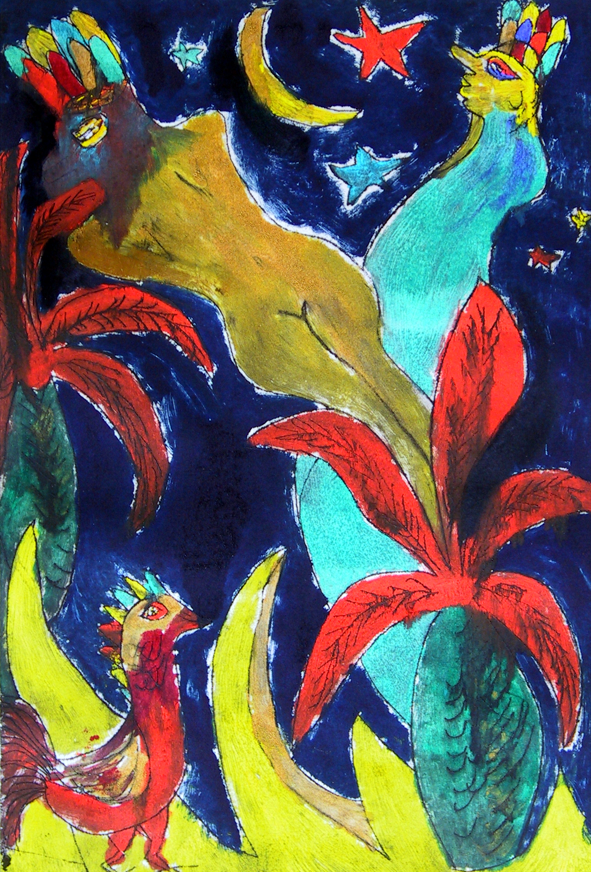 Bij de ballotage bij Pulchri Studio Den Haag is de examencommissie meerdere malen teruggekeerd om zich af te vragen ‘hoe doet ie dat toch’. Tja, dat nu is het geheim van de smid. Het grafisch vak en met name de grote etsen in kleur bereiken een fase vol magie als het werk onder de pers vandaan komt. Op het moment dat het etspapier van de plaat gescheiden wordt is dat magische moment daar. De inkt is nog nat en glimt, de kleuren spatten je tegemoet, de reuk van inkt en olieverf streelt je neusgaten. “Is het gelukt?” Ja! De schare kunstenaars in het etsatelier slaken verrukt kreetjes van bewondering. Het nieuwe kunstwerk dat de wereld aanschouwt is daar. Magie! Ik ben volslagen uitgeput en drink twee flesjes water achterelkaar leeg.
