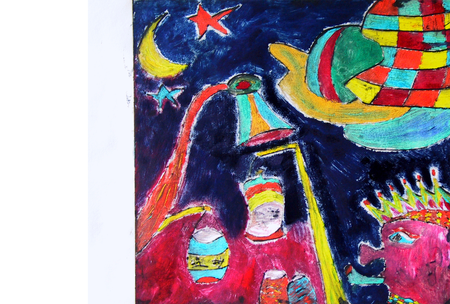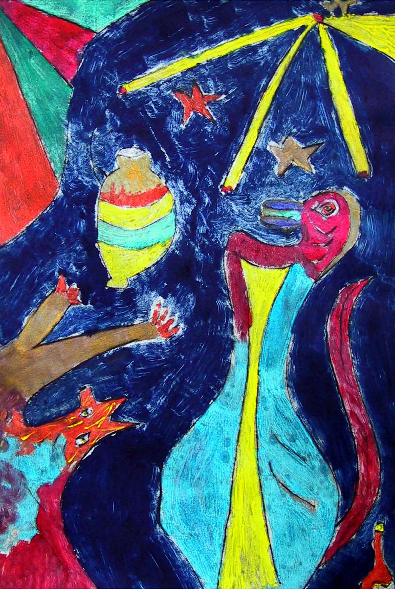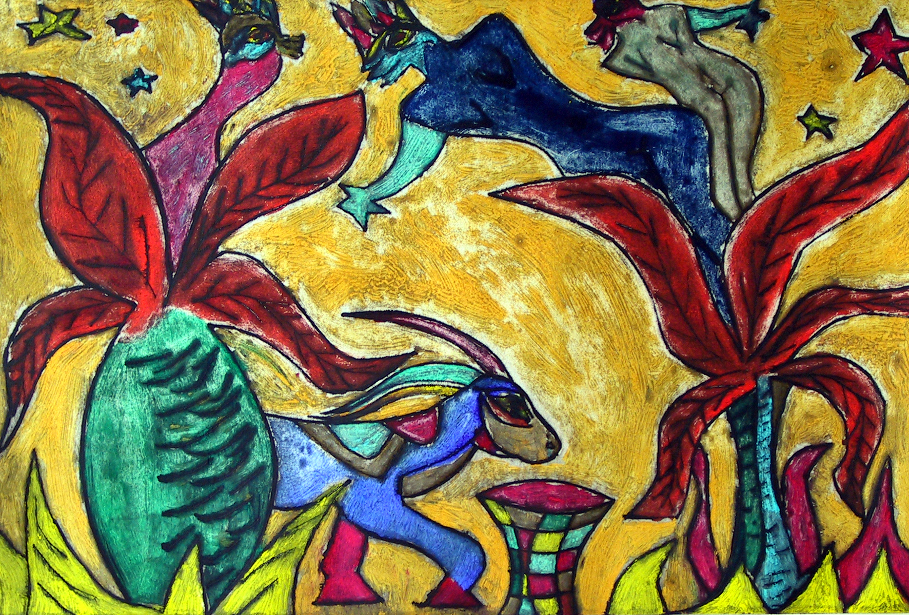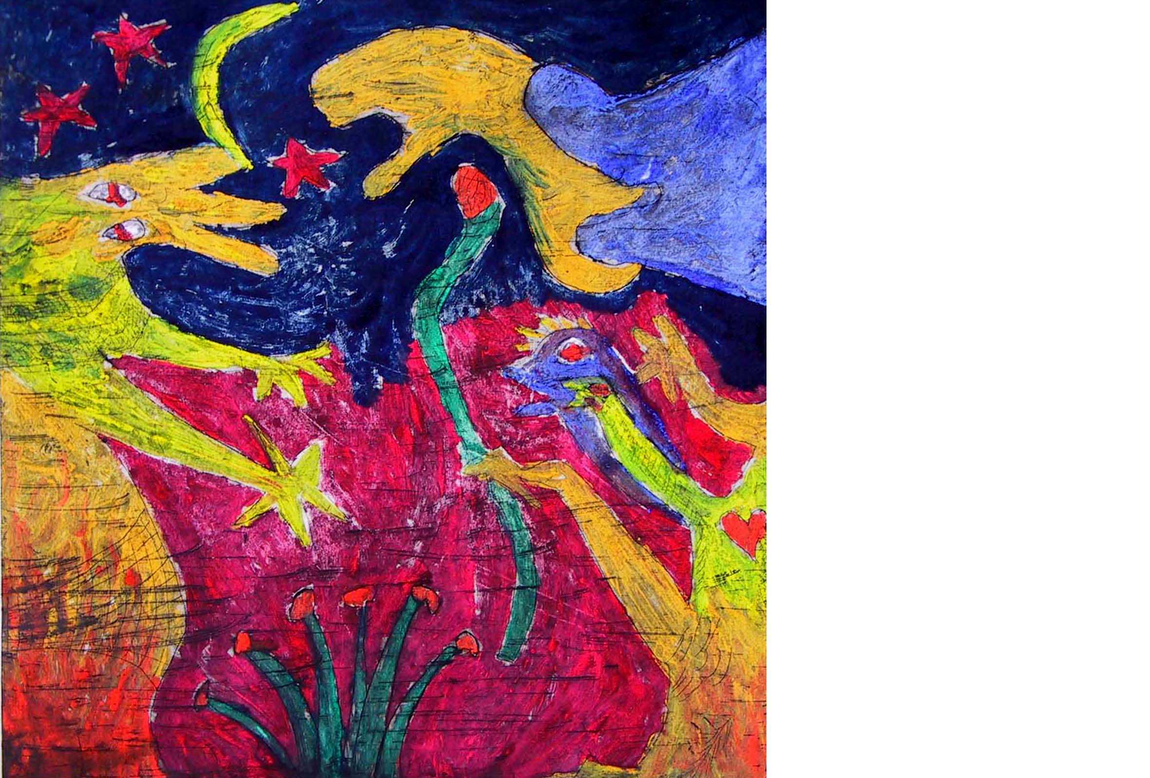 Bij de ballotage bij Pulchri Studio Den Haag is de examencommissie meerdere malen teruggekeerd om zich af te vragen ‘hoe doet ie dat toch’. Tja, dat nu is het geheim van de smid. Het grafisch vak en met name de grote etsen in kleur bereiken een fase vol magie als het werk onder de pers vandaan komt. Op het moment dat het etspapier van de plaat gescheiden wordt is dat magische moment daar. De inkt is nog nat en glimt, de kleuren spatten je tegemoet, de reuk van inkt en olieverf streelt je neusgaten. “Is het gelukt?” Ja! De schare kunstenaars in het etsatelier slaken verrukt kreetjes van bewondering. Het nieuwe kunstwerk dat de wereld aanschouwt is daar. Magie! Ik ben volslagen uitgeput en drink twee flesjes water achterelkaar leeg.
