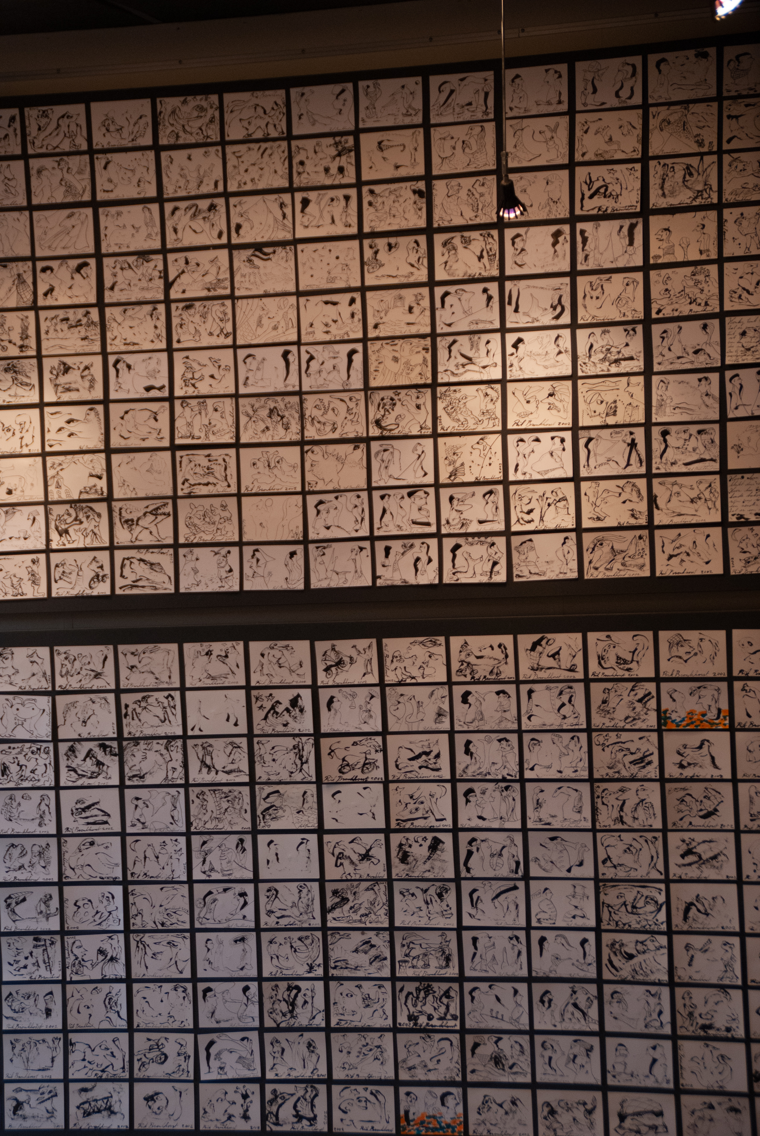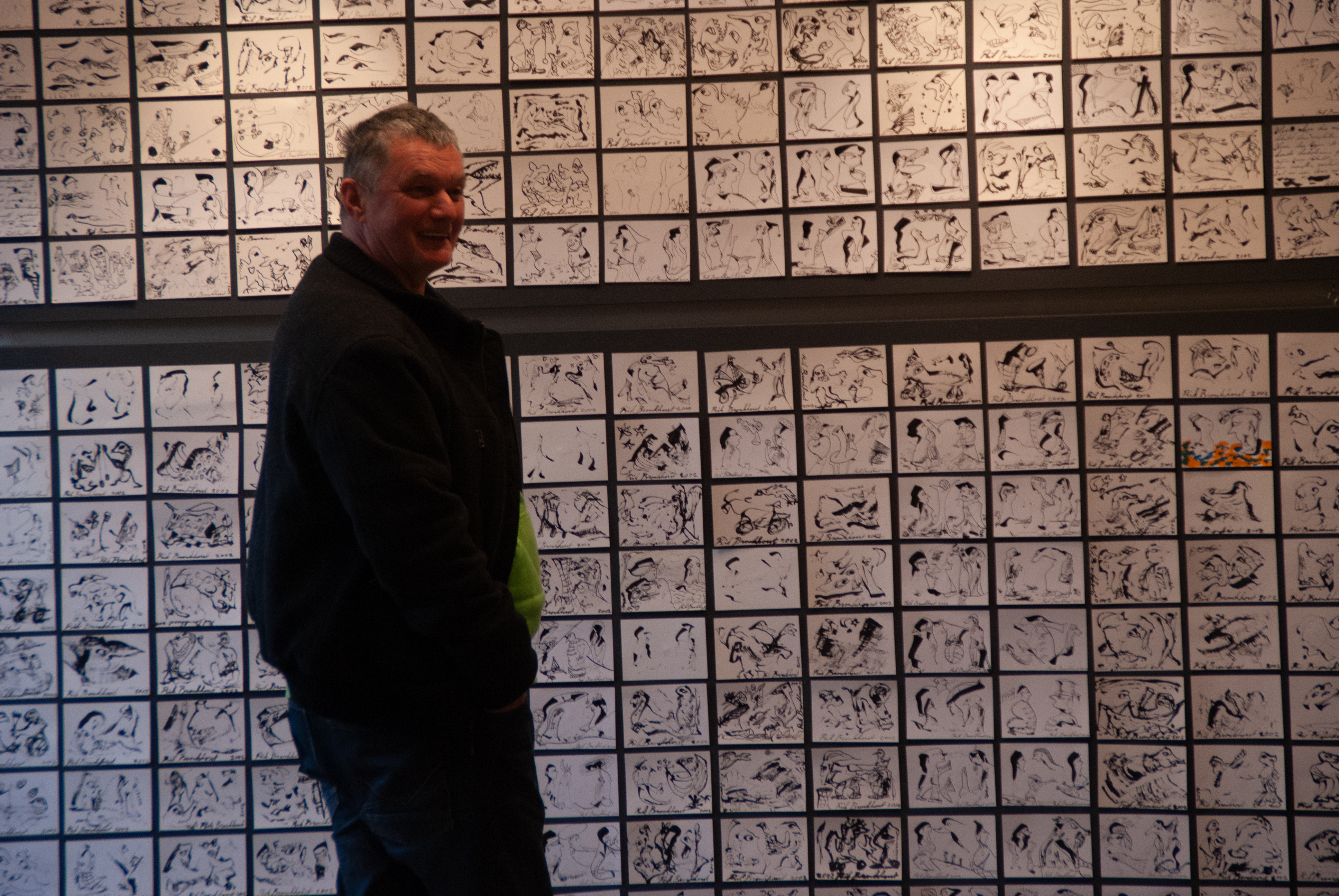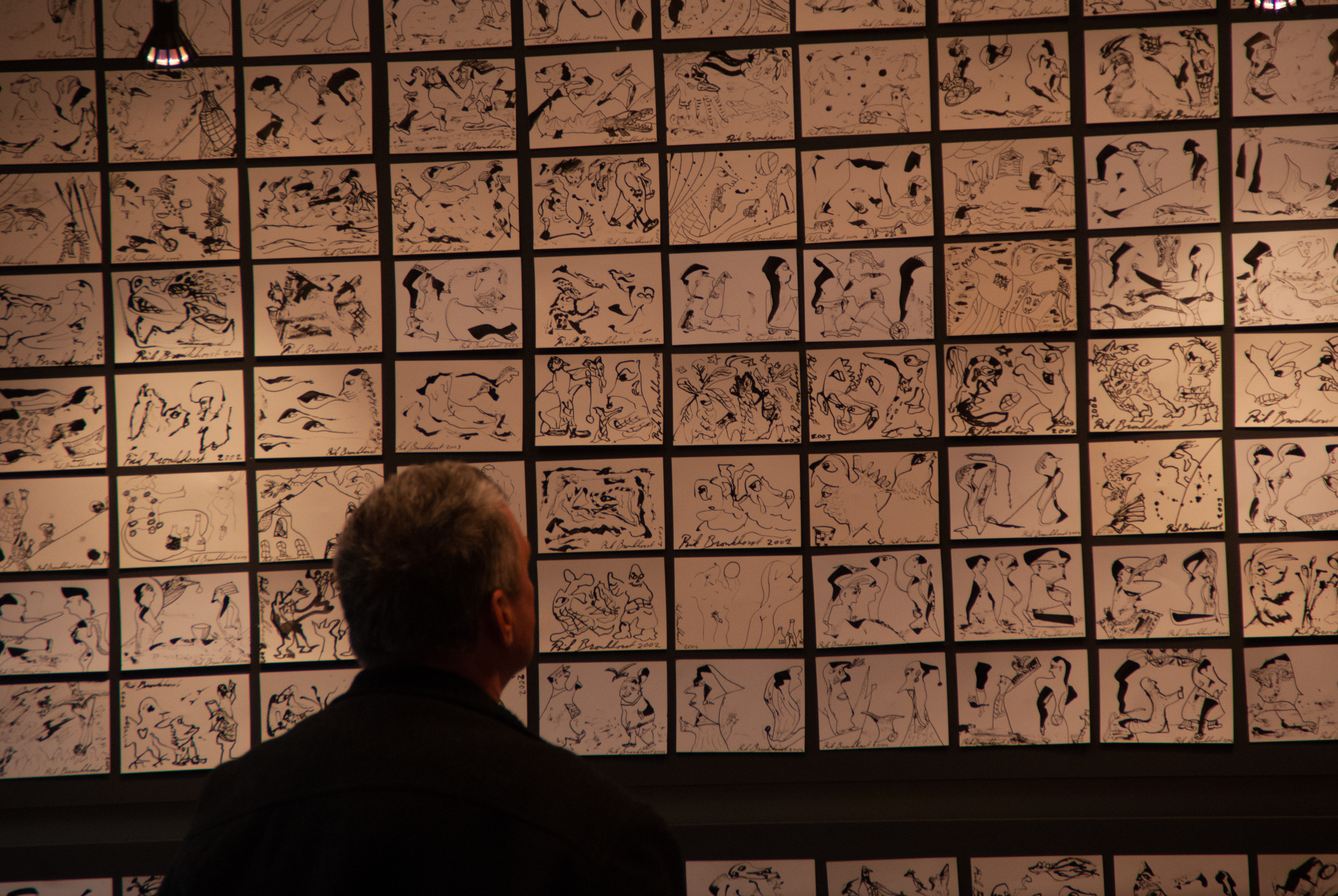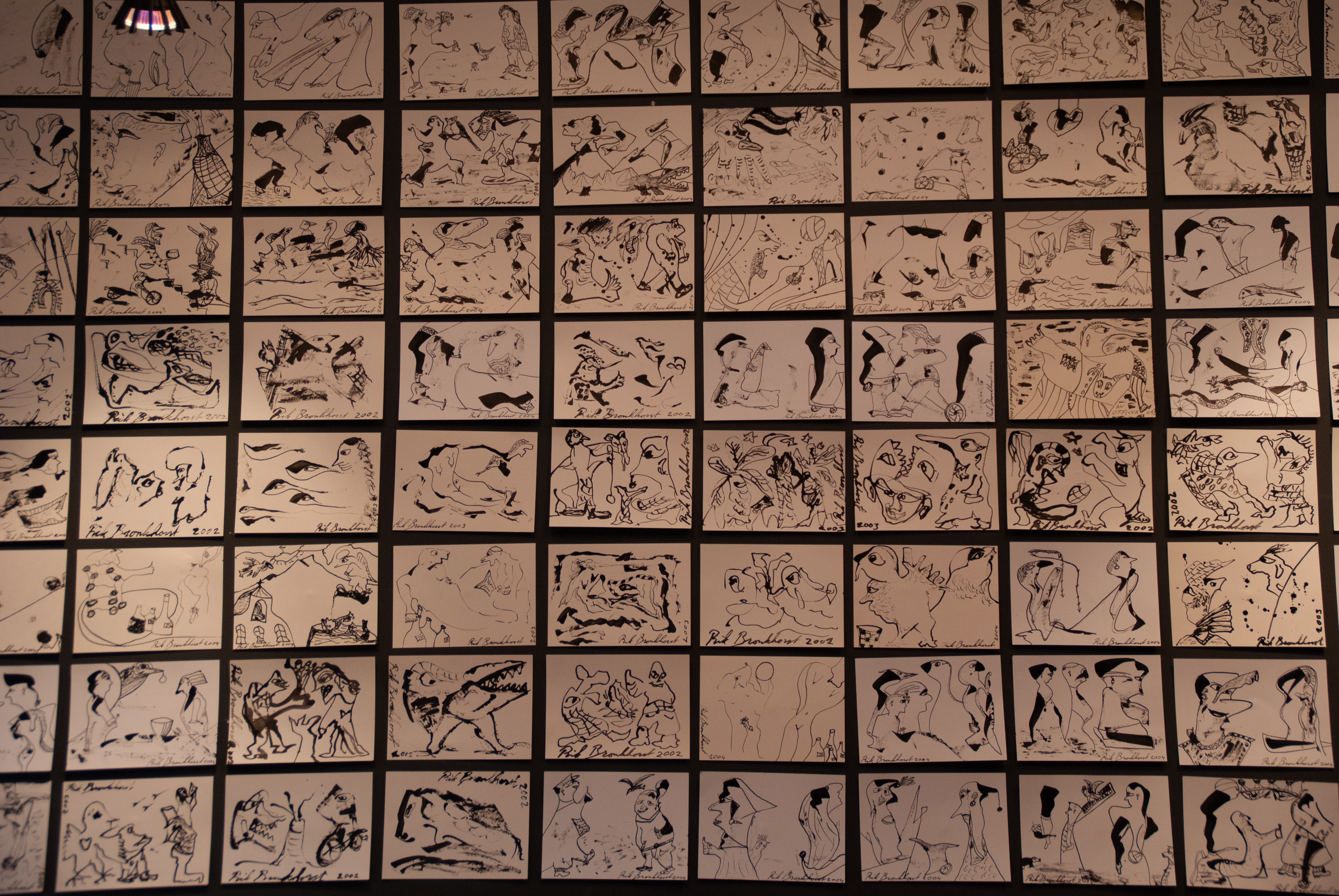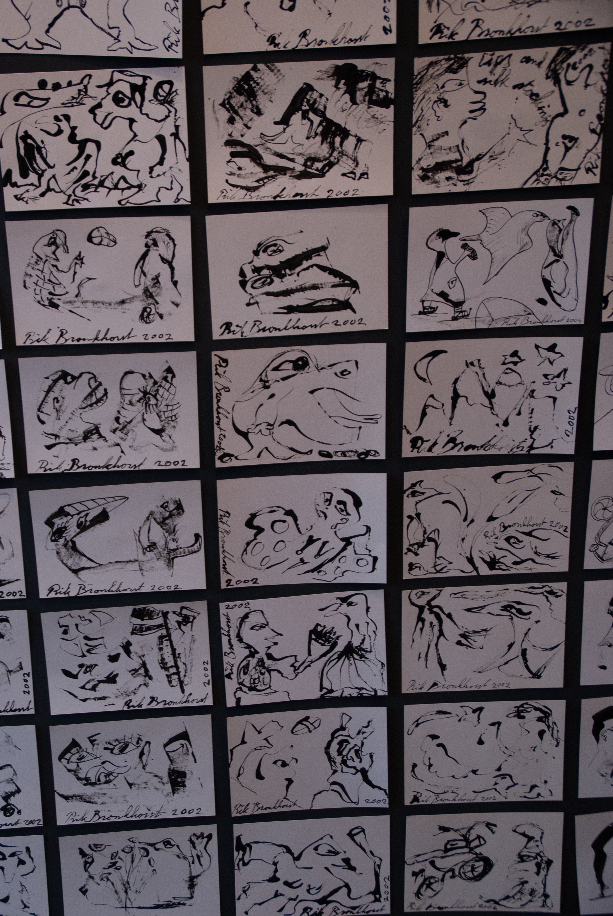 Zeker zo leuk en boeiend om te doen zijn de tekeningen met Encre de Chine, Oost-Indische inkt. Minder vermoeiend ook. Maar als er dan een complete wand mee volhangt, dan plaats ik een stoel ertegenover en blijf met evenveel verwondering kijken naar al die kort op elkaar geplaatste tekeningetjes. Een hele wand vol, magisch! En ook hier ontstaan deze pentekeningen als uit het niets. Puur intuïtief.